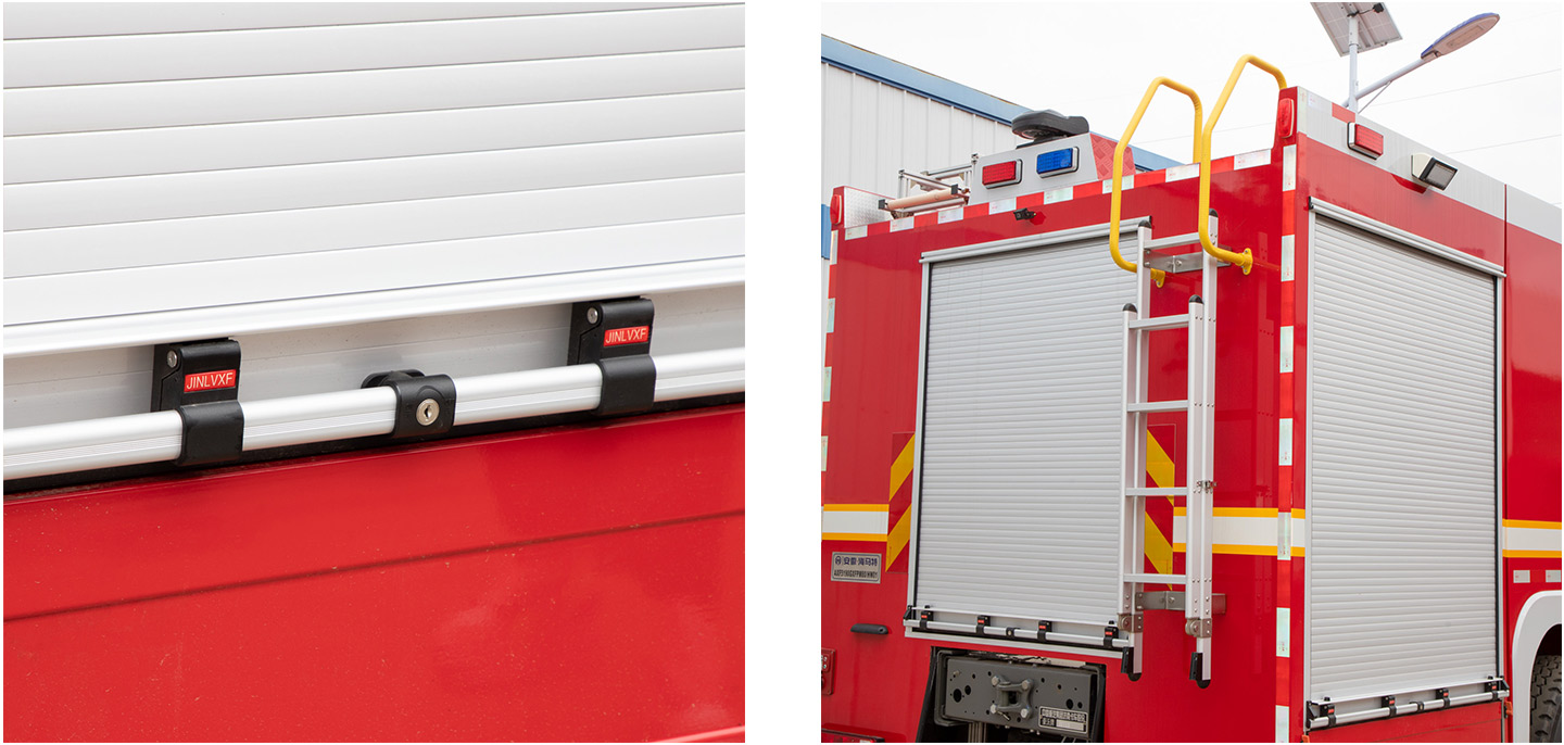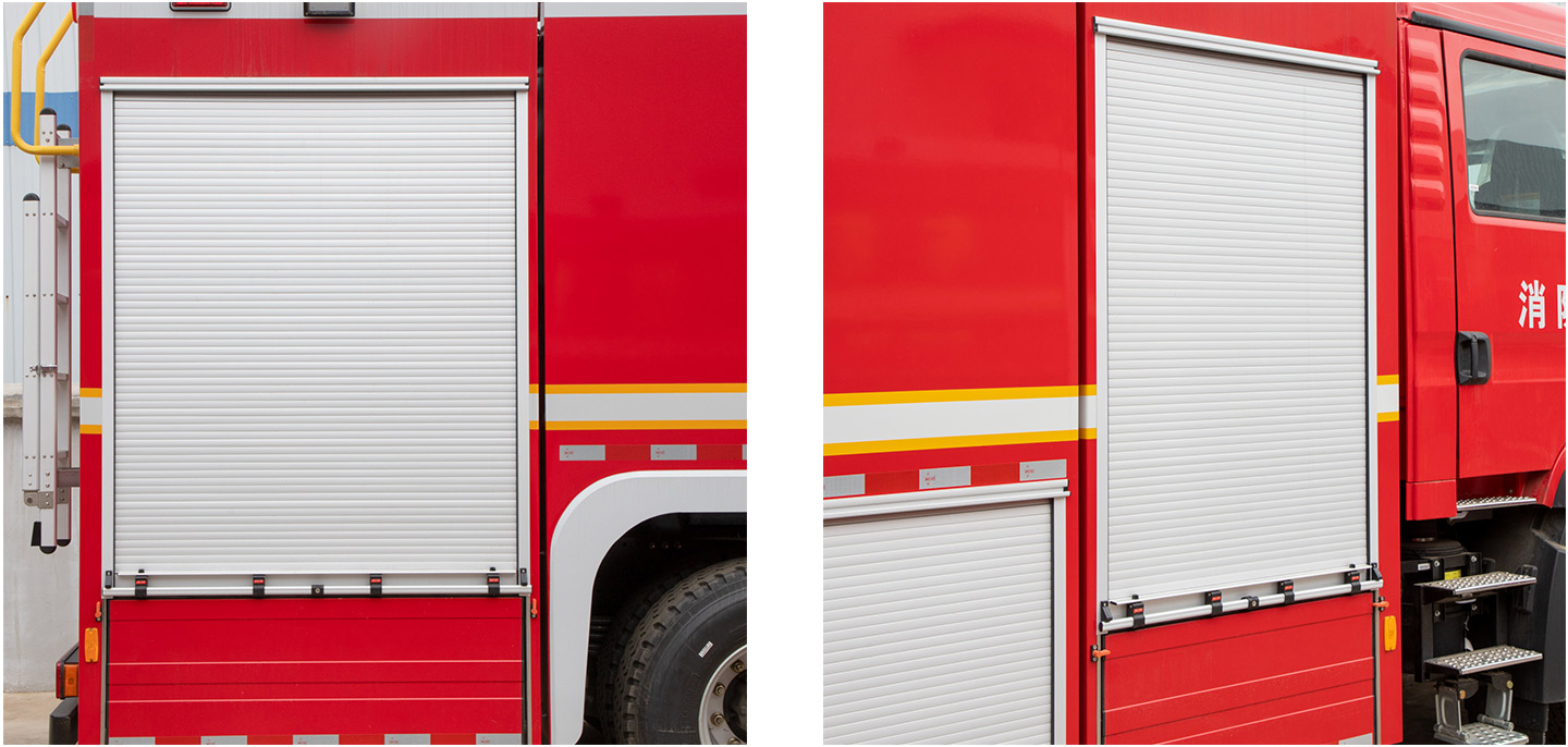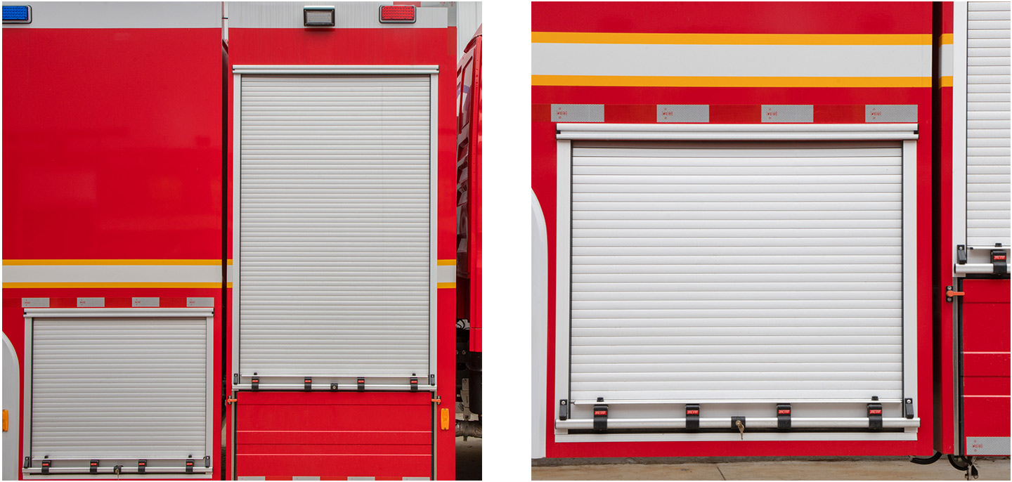 La puerta enrollable utilizada por el camión de bomberos está hecha de perfil de aluminio de fijación con un tratamiento superficial especial, que es fácil de instalar, de apariencia hermosa, liviana, impermeable, a prueba de polvo y golpes, y puede considerarse como un accesorio para camiones de bomberos. y otros vehículos modificados.